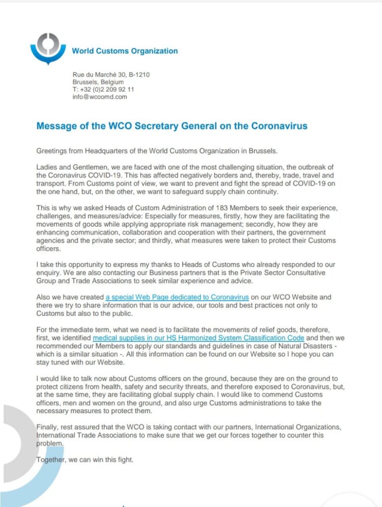 رسالة الأمين العام لمنظمة الجمارك العالمية بشأن فيروس كورونا snxrk November 5, 2024 تحية من مقر منظمة الجمارك العالمية في بروكسل. سيداتي وسادتي ، نحن نواجه واحدة من أكثر المواقف تحديا ، تفشي Read More...