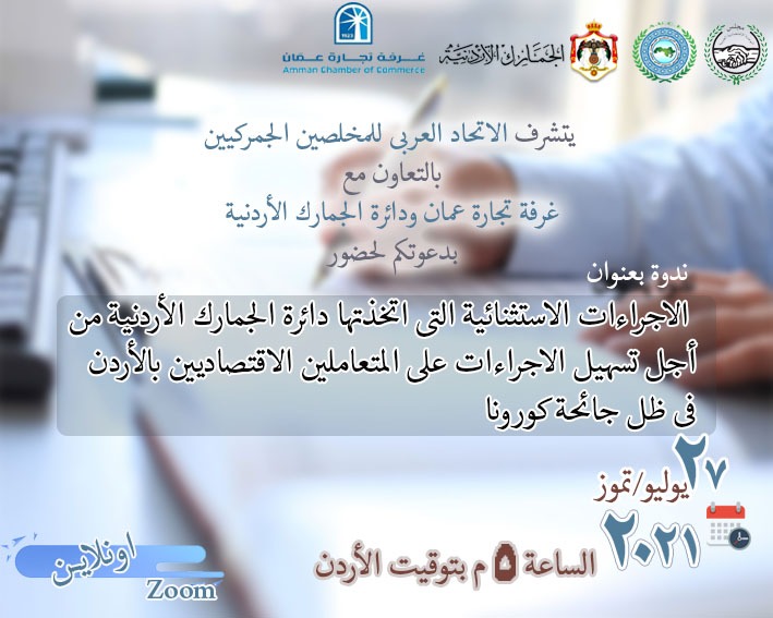 يتشرف الاتحادالعربى للمخلصين الجمركيين بالتعاون مع غرفة تجارة عمان ودائرة الجمارك الاردنية، بدعوة السادة المتعامليين الاقتصاديين (مخلصي الجمارك و المصدرين