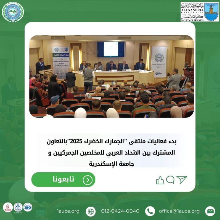 انطلقت اليوم فعاليات ملتقى “الجمارك الخضراء 2025”، الذي ينظمه الاتحاد العربي للمخلصين الجمركيين بالتعاون مع جامعة الإسكندرية – كلية الأعمال،